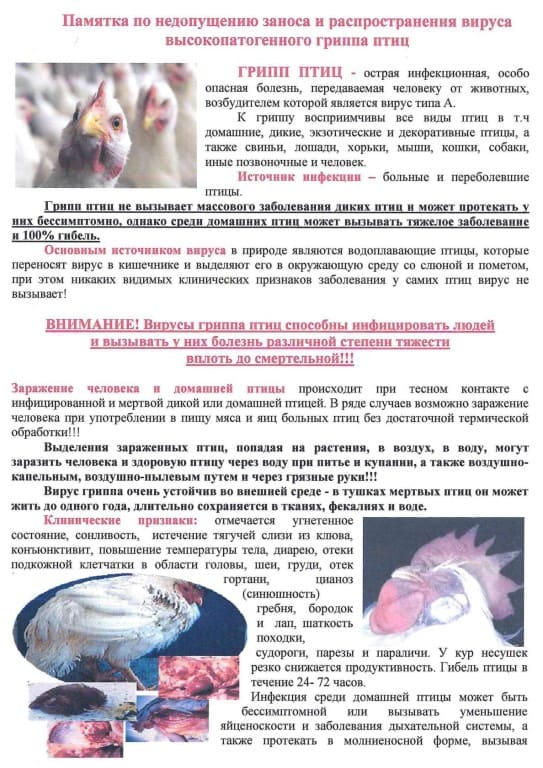 Заражение человека и домашней птицы происходит при тесном контакте с инфицированной и мертвой дикой или домашней птицей. В ряде случаев возможно заражение человека при употреблении в пищу мяса и яиц больных птиц без достаточной термической обработки!!!